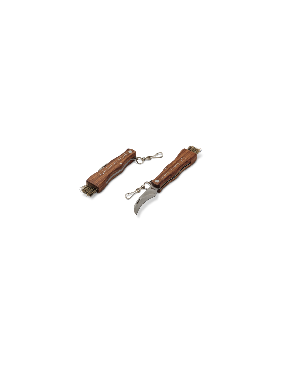 Smidig svampkniv med vikbart knivblad och handtag i trä. Kniven är försedd med borste som effektivt avlägsnar jord och annat skräp från svampen. Nu med mätskala på ena sidan och praktisk kedja med en liten karbinhake i ändan. Knivbladet är mycket vasst och kniven bör därför förvaras utom räckhåll för barn.