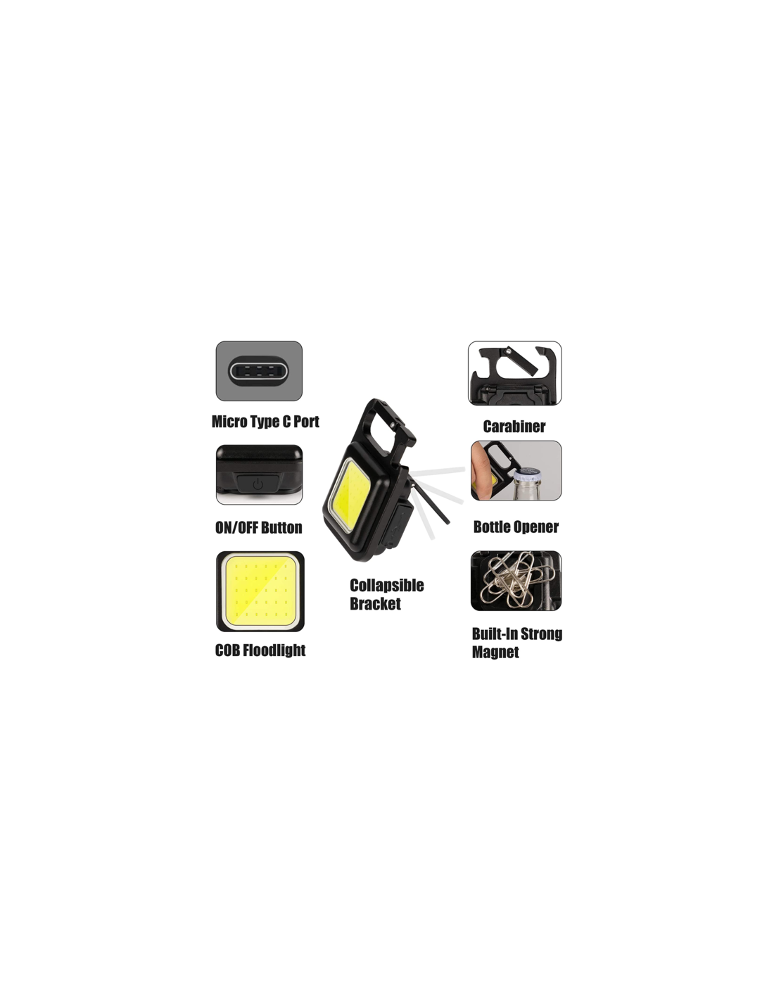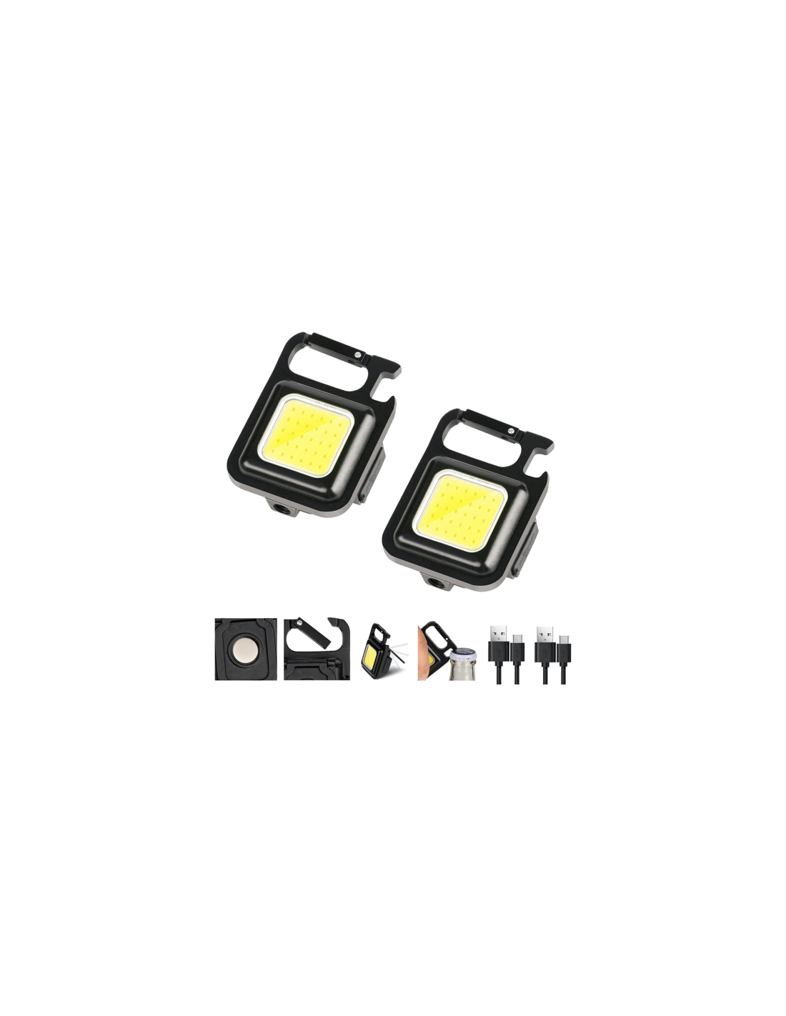 Liten och smidig lampa med COB/LED-dioder. Ljusstyrka 300 lumen. Karbinhake, magnet, stöd och flasköppnare. Laddningsbar.