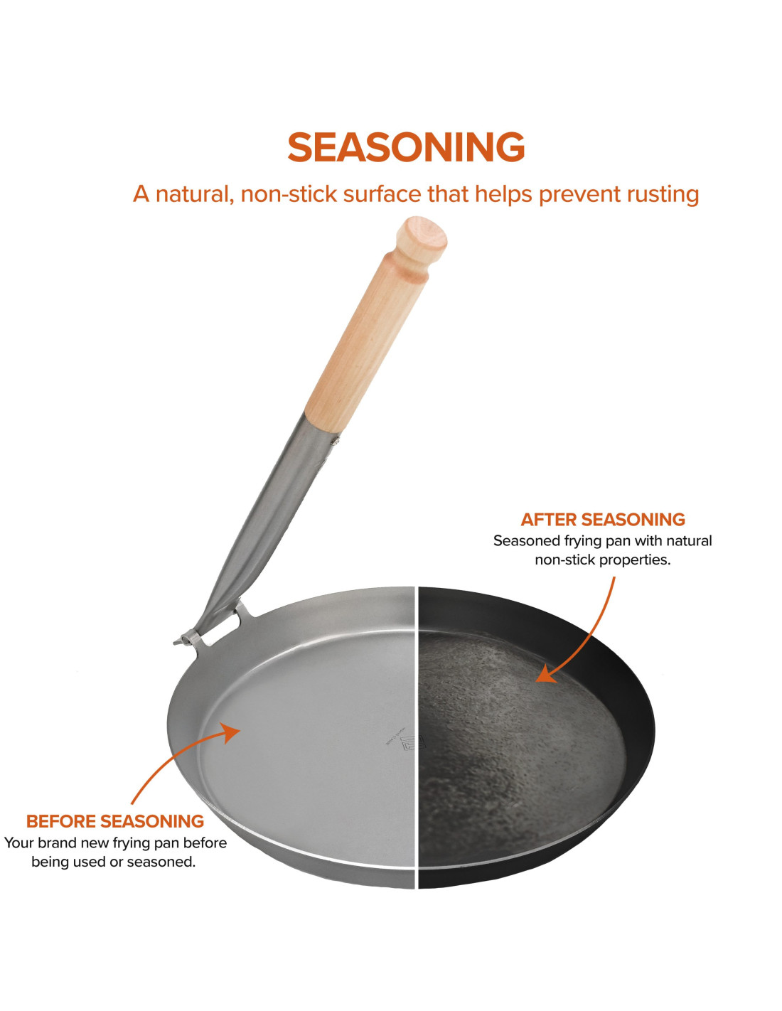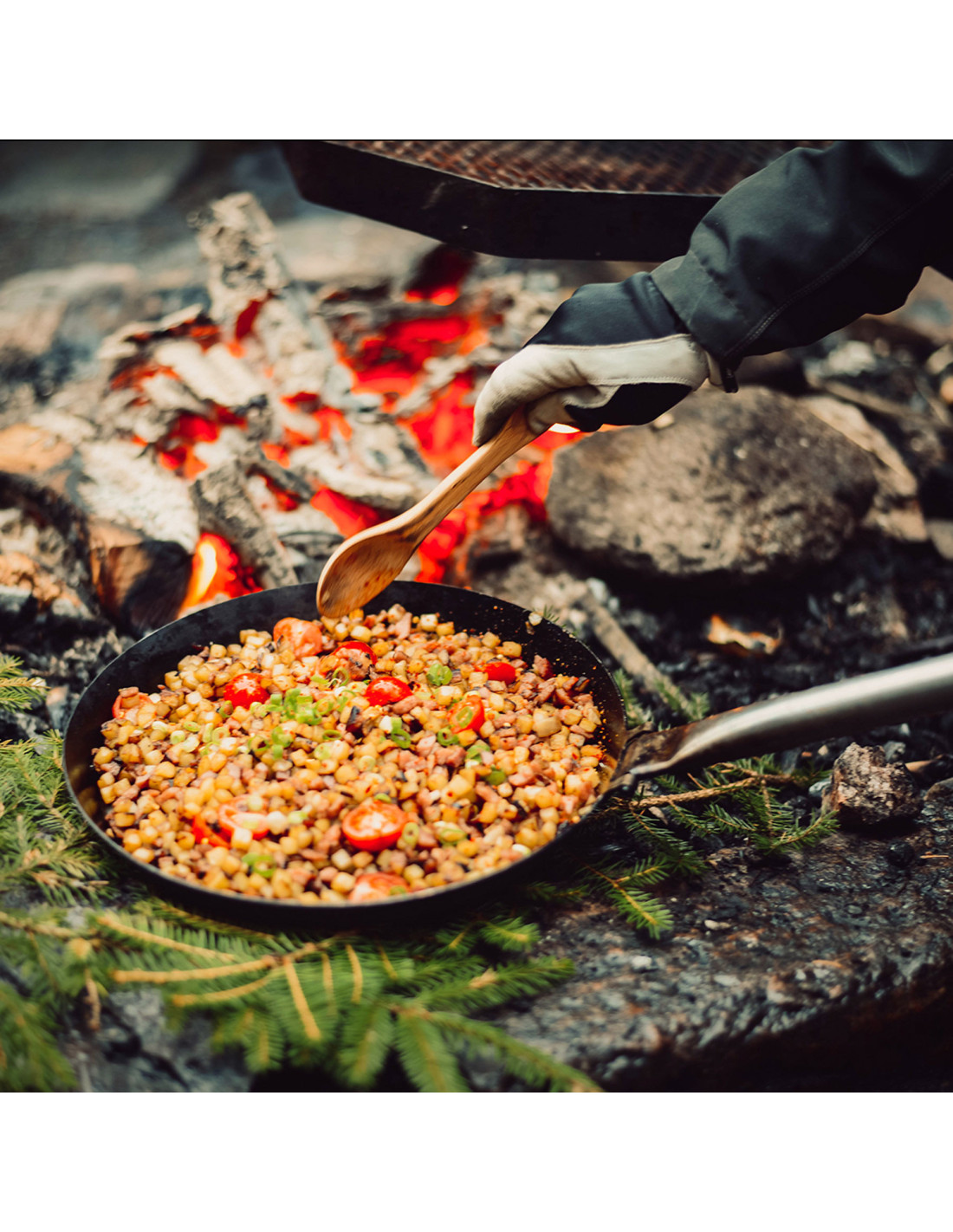 Kolstål lämpar sig bra för användning vid lägereld då det tål höga temperaturer. Ju mer du använder din panna desto bättre stekegenskaper kommer den att få.
