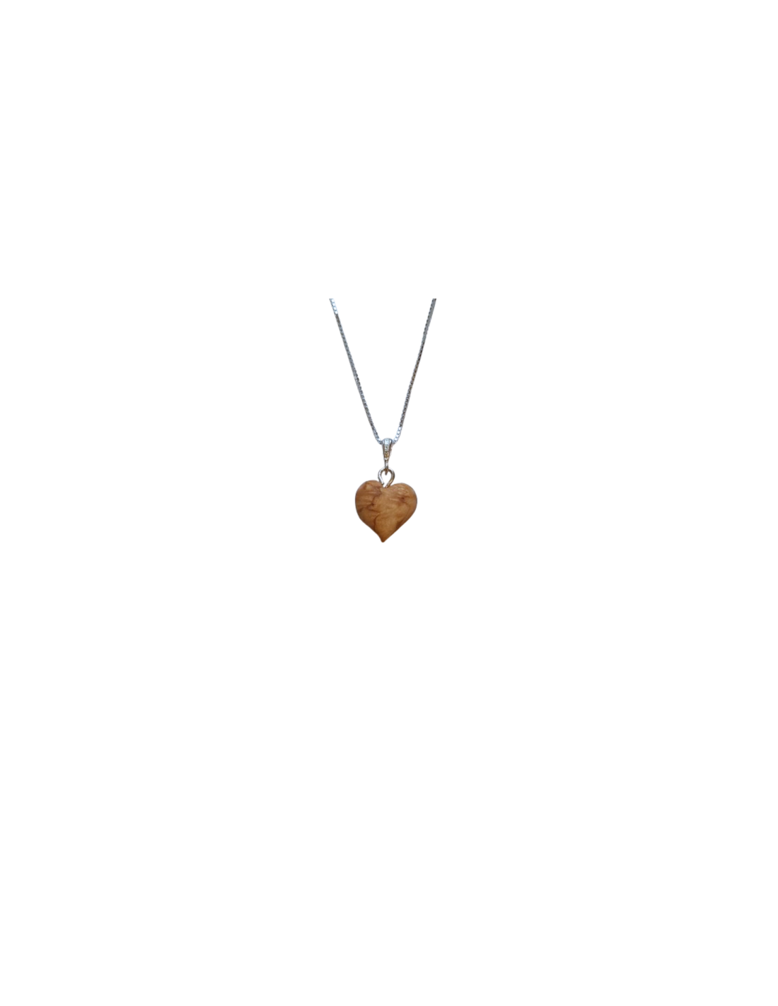 Ett hjärtformat halsband i masurbjörk med silverkedja.