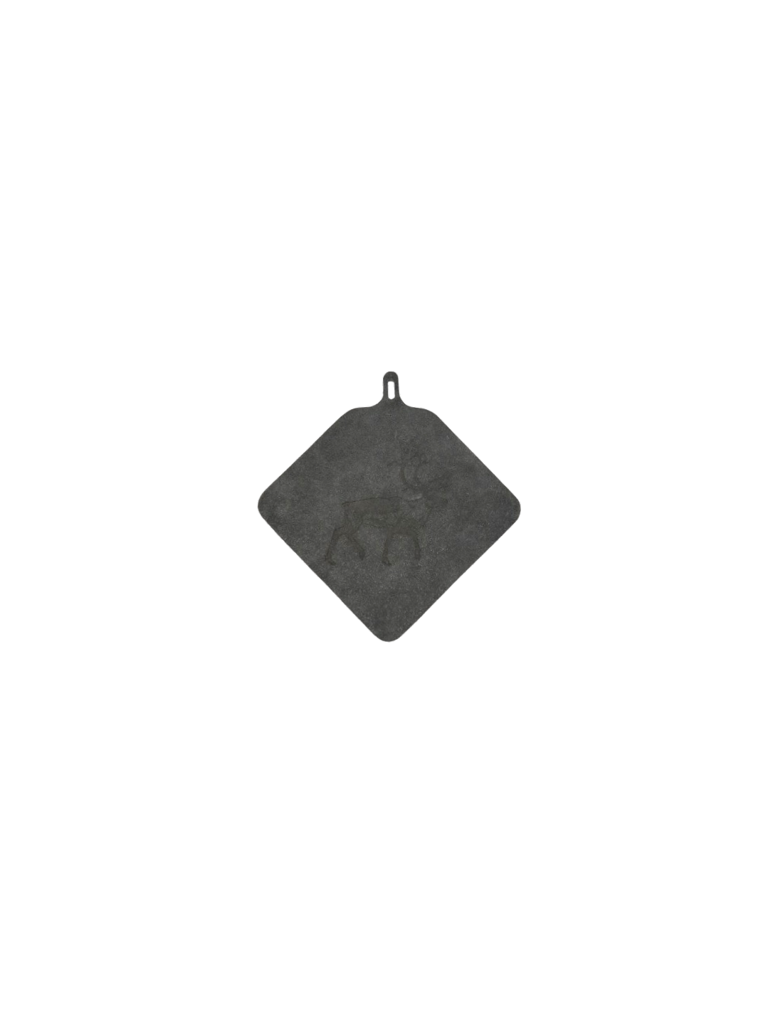 A handmade potholder in gray split suede with a print of a reindeer. Locally produced in Sweden at Tärnsjö tannery.