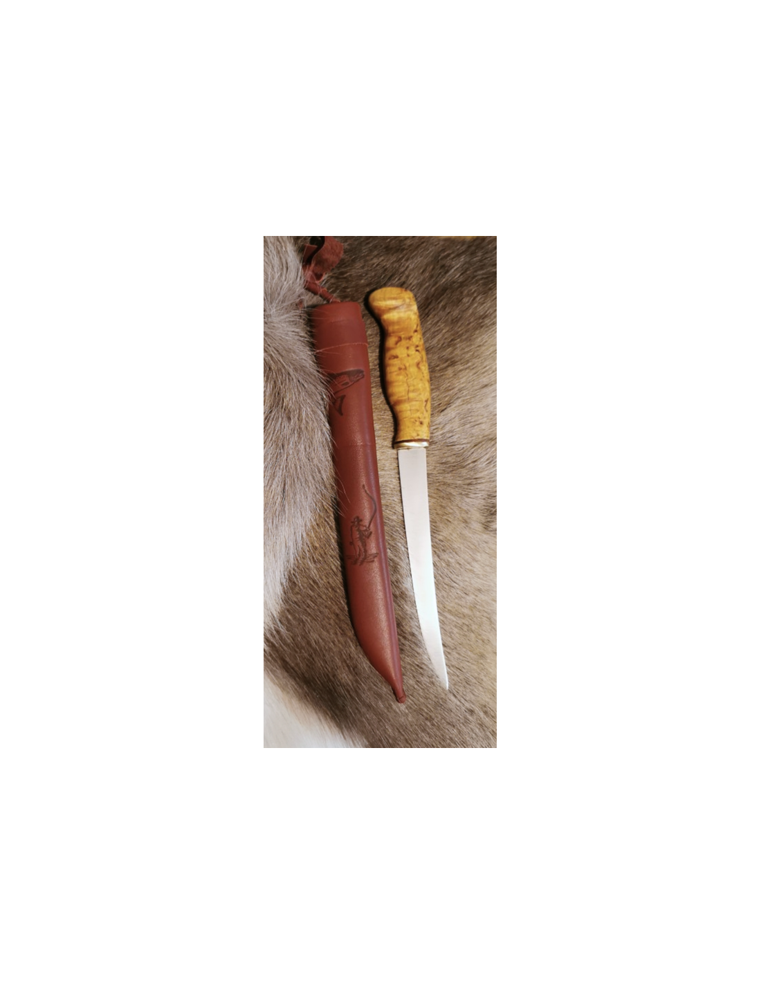 En fiskekniv med vackert handtag av masurbjörk. Det tunna och flexibla bladet gör den lämplig att filéa fiskar med.