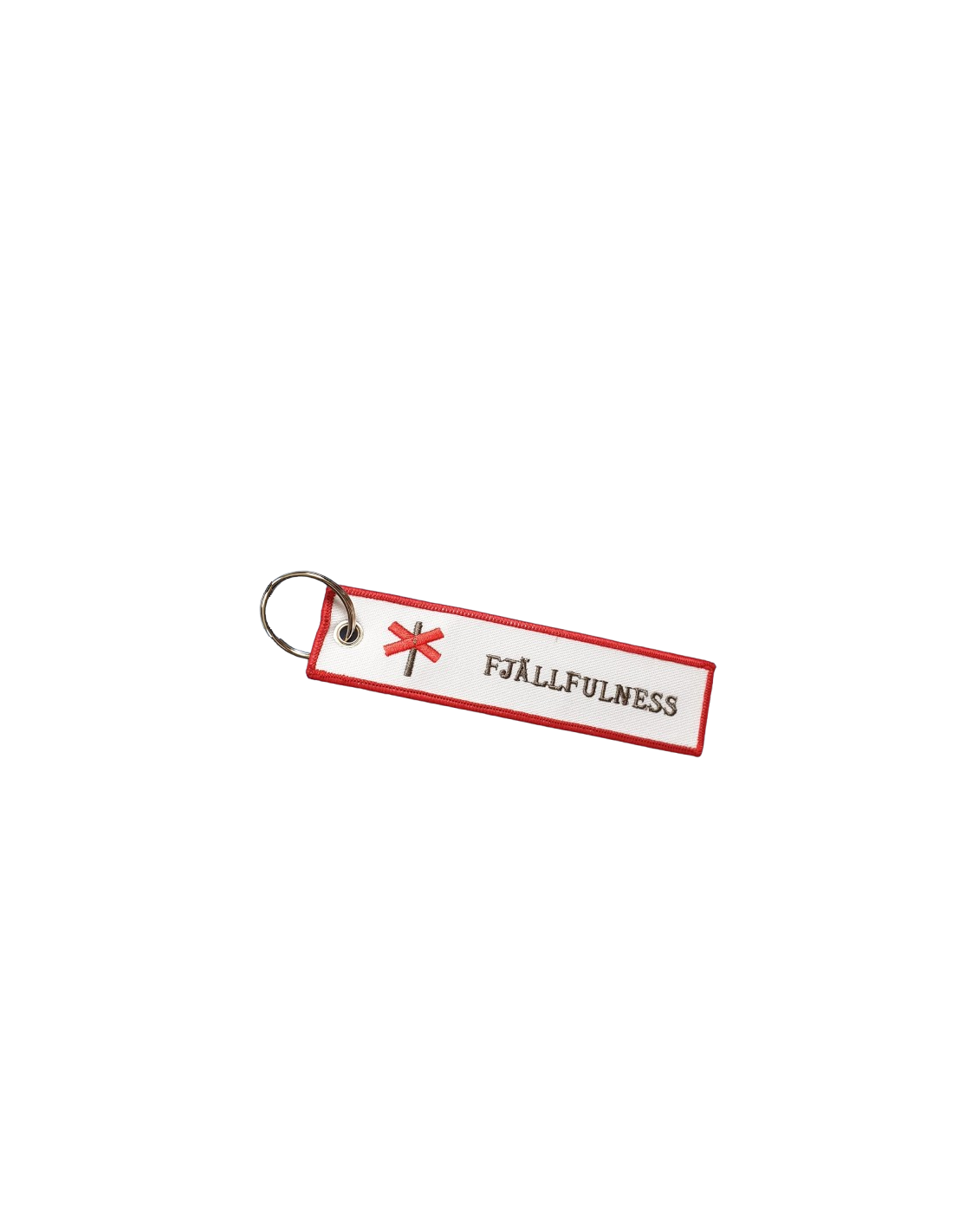 Strong tag with double-sided embroidery as well as eyelet and key ring.