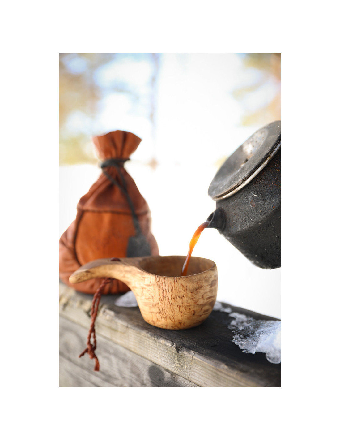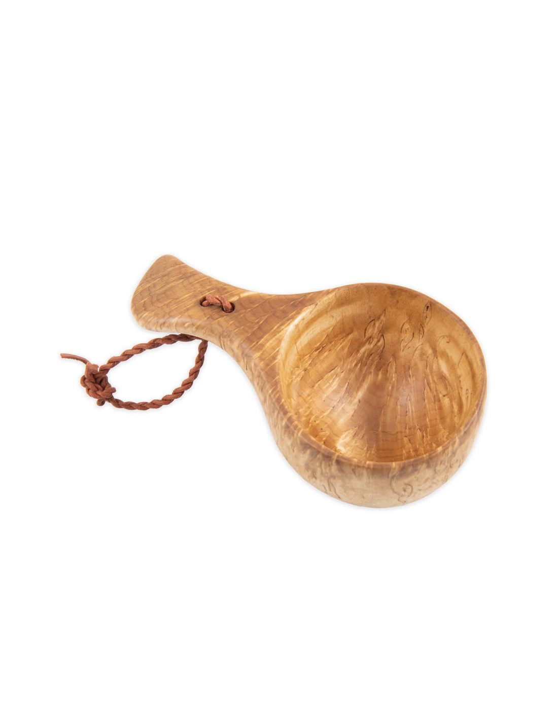 Traditional kuksa made of Nordic masur birch with twisted leather strap made of reindeer hide.