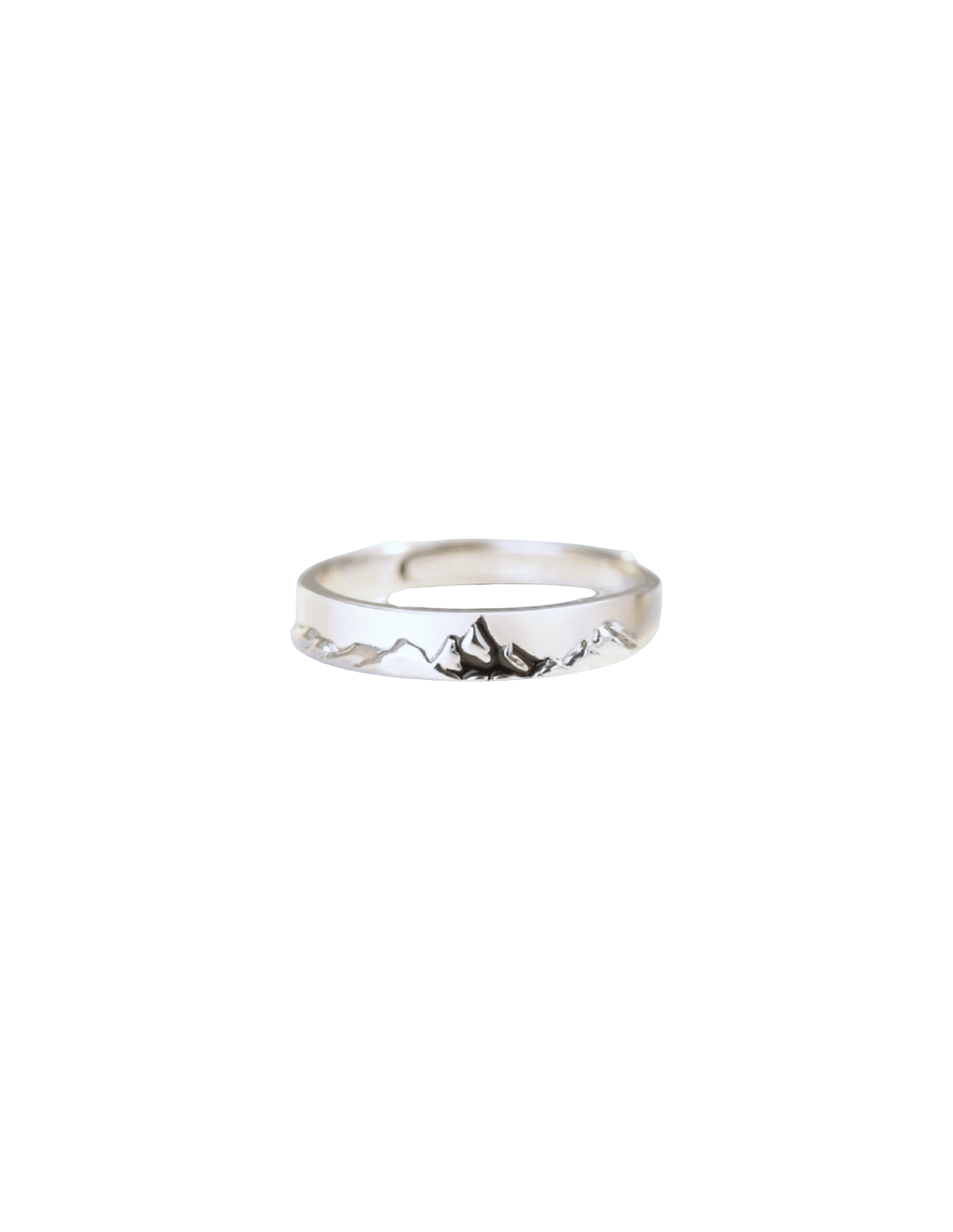 A thin, adjustable silver ring with a raised motif of a mountain range.