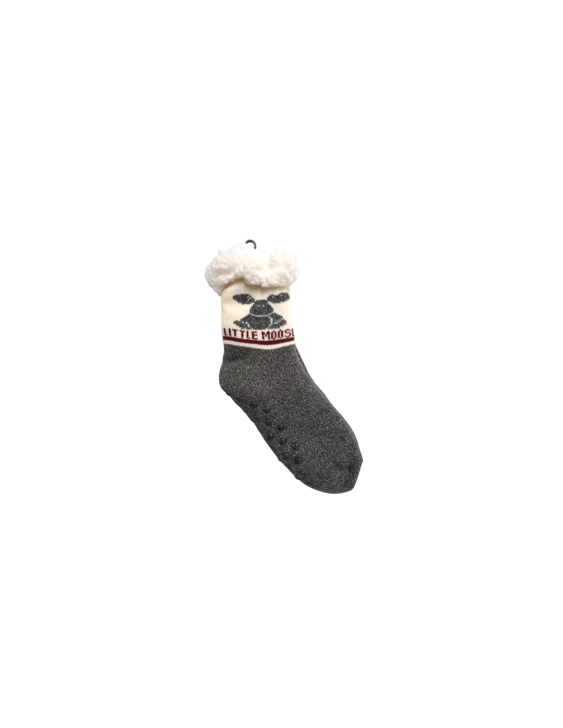 Fluffy socks for children ages 6-9. The socks have a no-slip bottom and a motif of a little moose.