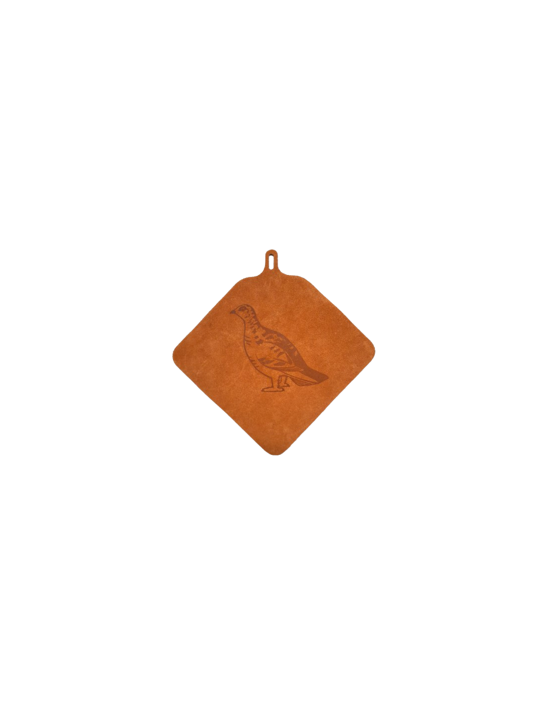 A handmade potholder in light brown split suede with a print of a ptarmigan. Locally produced in Sweden at Tärnsjö tannery.