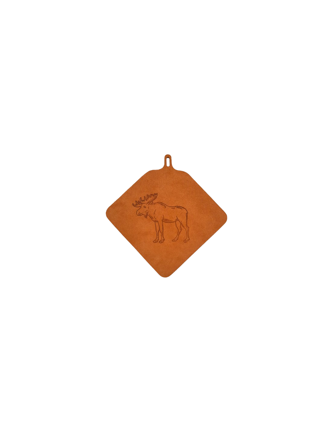 A handmade potholder in light brown split suede with a print of a moose. Locally produced in Sweden at Tärnsjö tannery.