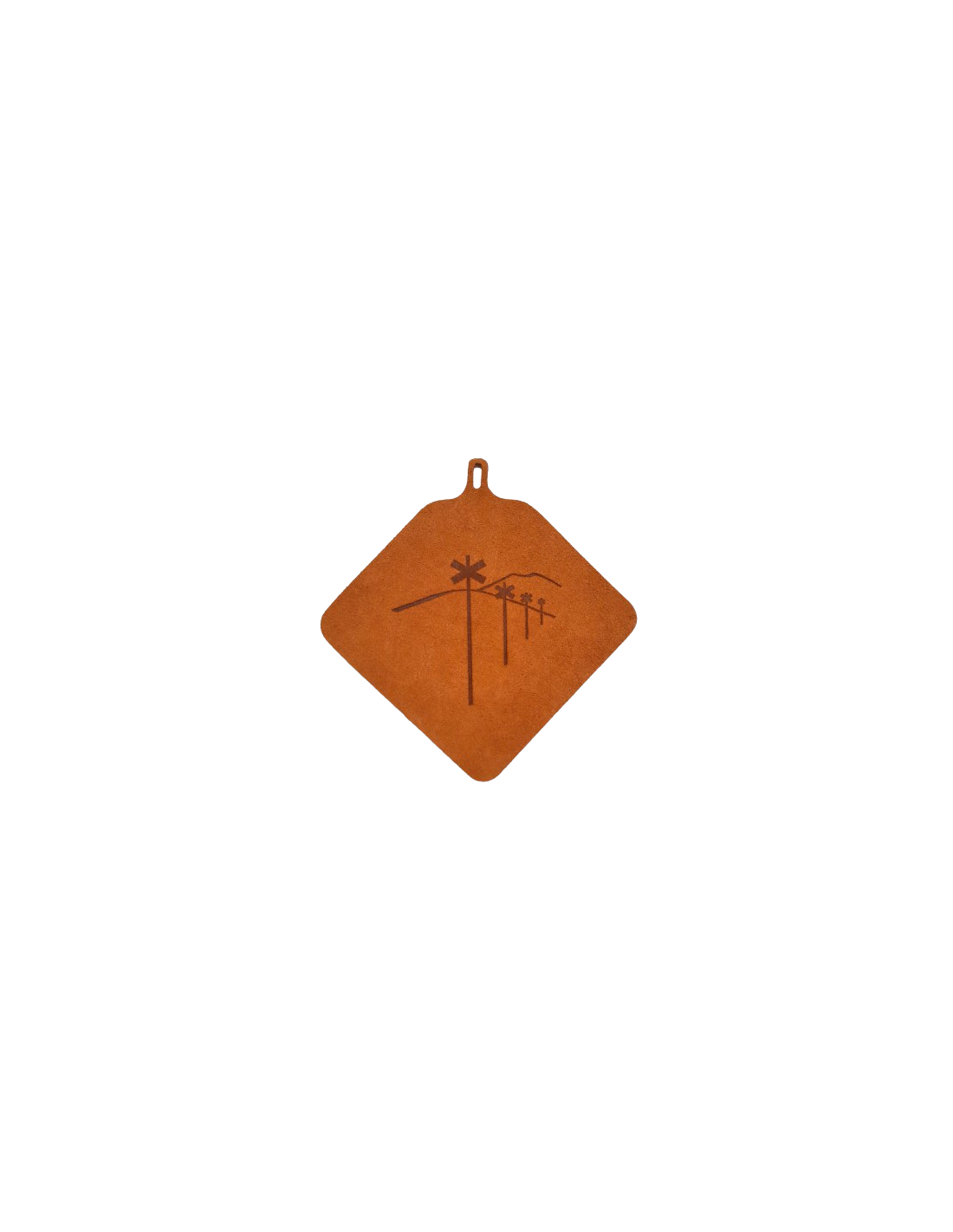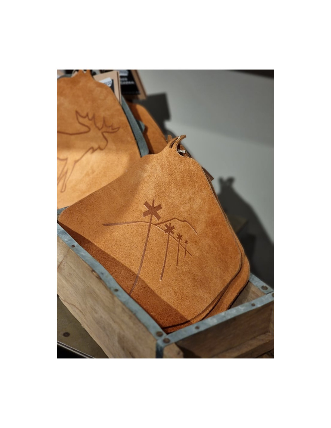 A handmade potholder in light brown split suede with a print of trail markers. Locally produced in Sweden at Tärnsjö tannery.